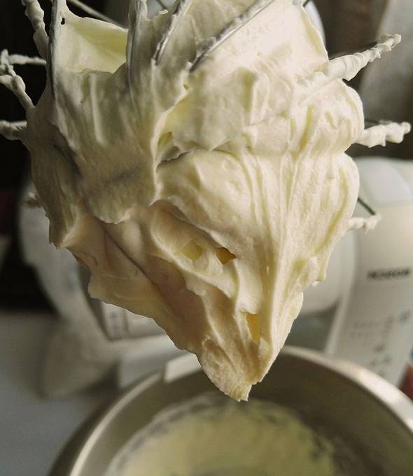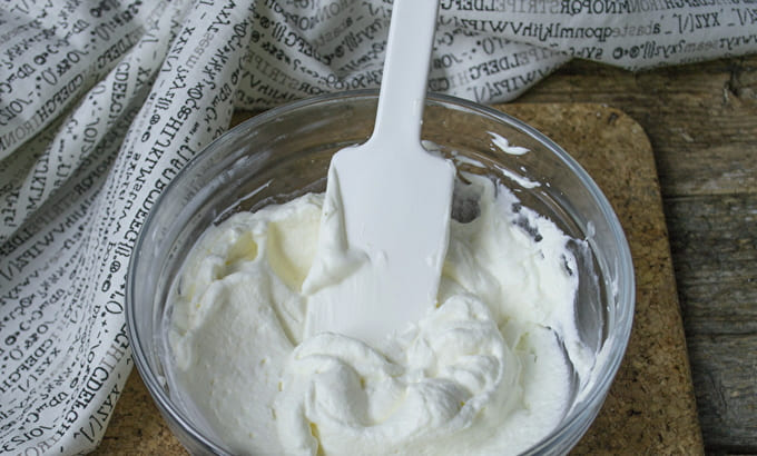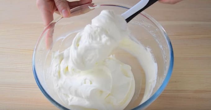 Deze crème is ideaal voor tussenlagen van cakelagen gemaakt van elk deeg. Het is delicaat, niet plakkerig, met een uitgesproken romige smaak en lijkt een beetje op een ijsje. De consistentie van de massa is dik genoeg om het oppervlak en de zijkanten van de cakes waterpas te maken. Om zo'n crème te bereiden, moet je een crème met minimaal 30% vet gebruiken. Een belangrijk punt is dat ze voor het opkloppen goed in de koelkast moeten worden afgekoeld.