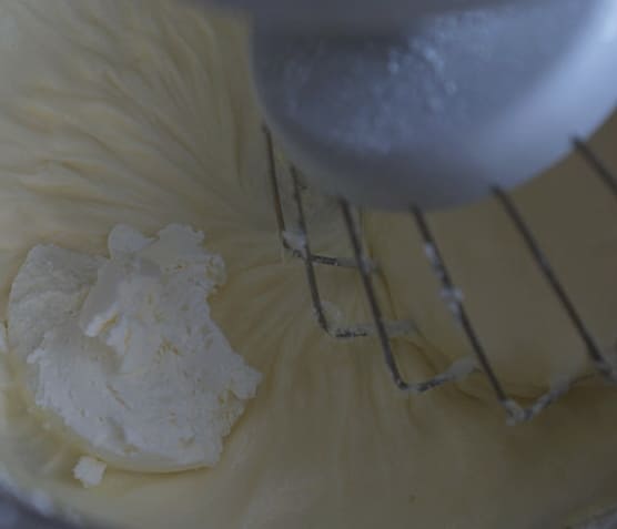 - Doe de roomkaas en de mascarpone in een kom om op te kloppen. Voeg direct de room en poedersuiker toe.