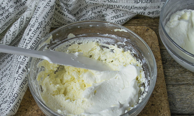 - Voeg vervolgens de roomkaas toe. We doen dit beetje bij beetje, op een lepel, omdat het moeilijk is om het hele volume van het product in één keer te mengen. Bovendien kan kaas gewoon door de keuken vliegen. Nadat je alle kaas hebt toegevoegd, klop je nog een minuut of twee, niet meer. Als u de inwerktijd met de crème overschrijdt, kan deze gaan delamineren.