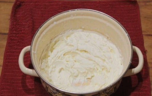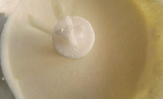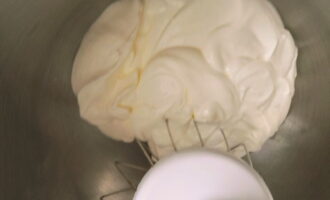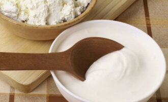 We verspreiden zachte kwark in de zure roommassa en kloppen 5-7 minuten met een matige snelheid. De inhoud moet glad en luchtig zijn.