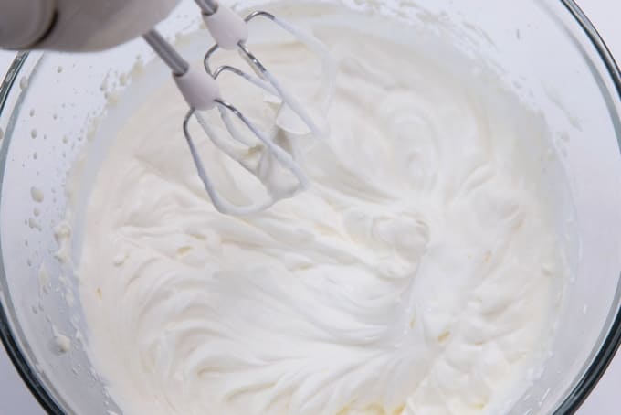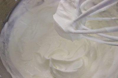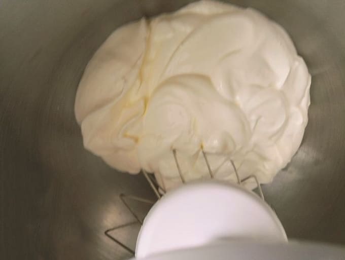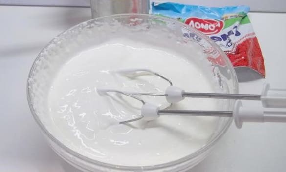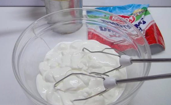 - Giet zure room in een diepe kom en klop 3-4 minuten op hoog vermogen. Het product moet luchtiger worden.