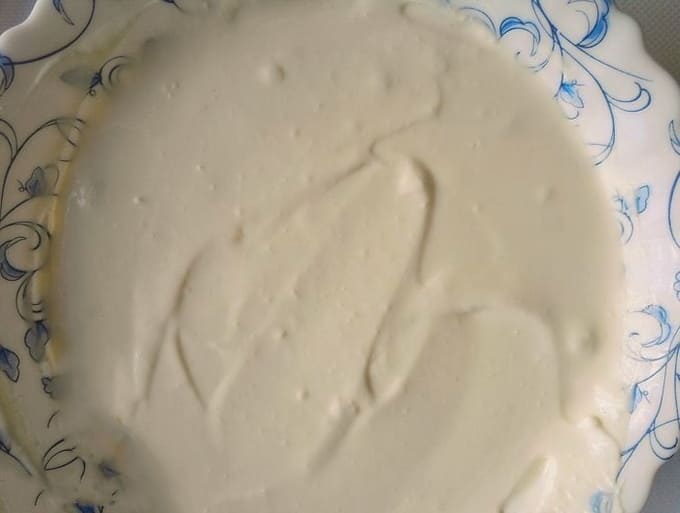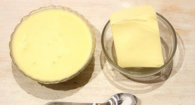 Uit gecondenseerde melk en boter wordt een dikke en vette room verkregen. Het product is goed voor het impregneren van een biscuittaart, het geeft ook een originele rijke smaak aan het dessert.
