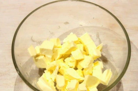 - We halen de boter van tevoren uit de koelkast en snijden hem voor het gemak in kleine vierkantjes.