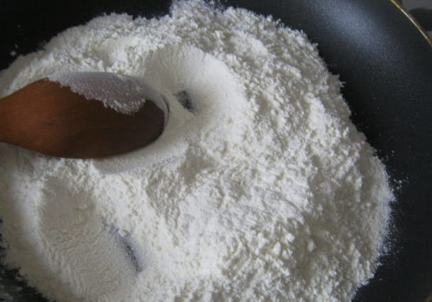 - Zeef de bloem en verwarm deze in een pan gedurende maximaal 1 minuut.
