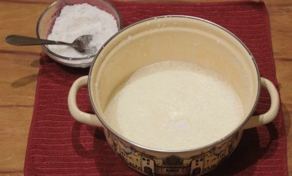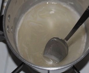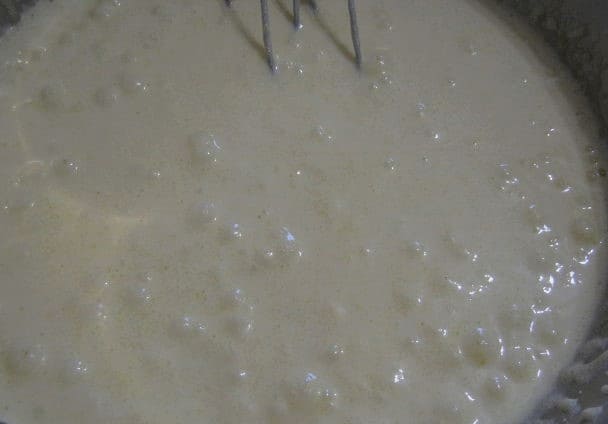 - Giet melk in de opgeklopte massa. We zetten de inhoud op het fornuis, brengen aan de kook en koken dan op laag vuur 2-3. Roer constant.
