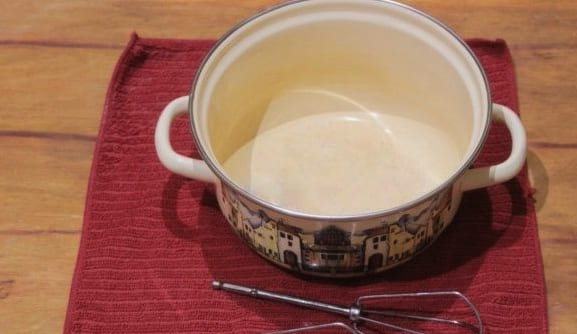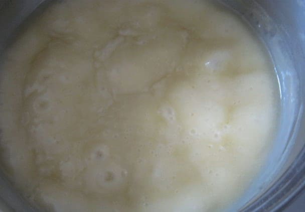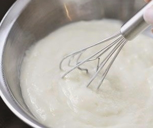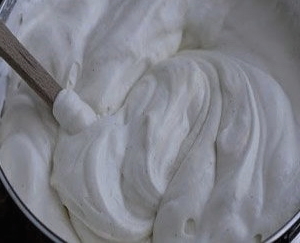 - We beginnen zure room te kloppen. Giet geleidelijk het droge mengsel erbij.