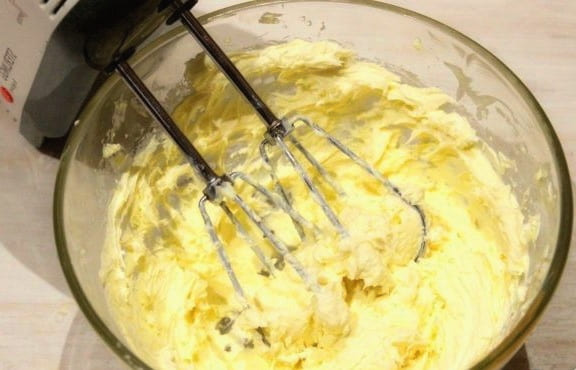 - Klop de zachte boter met een mixer tot het product verdubbelt.
