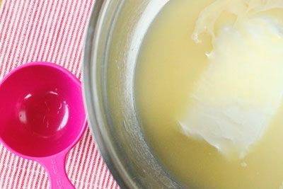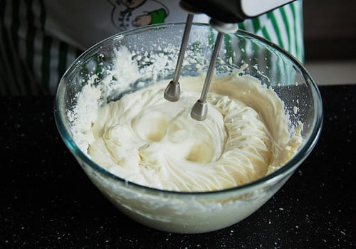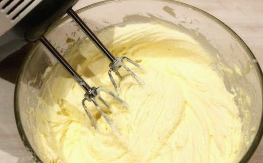 - Voeg gesmolten boter toe aan de room en klop de inhoud 1-2 minuten.