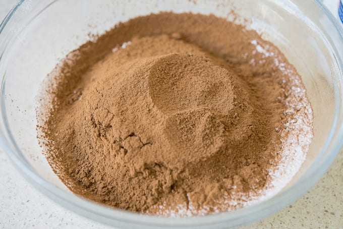 - Combineer cacao en poedersuiker in een diepe kom. Meng droge ingrediënten door elkaar.