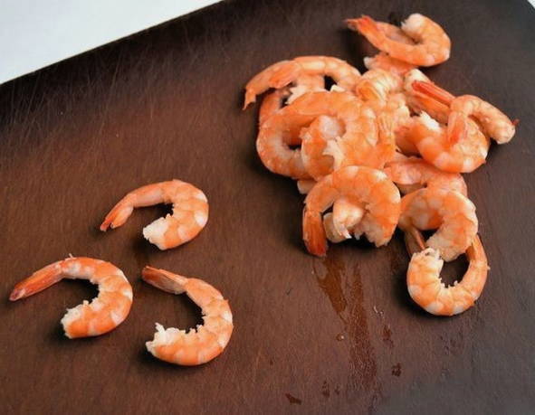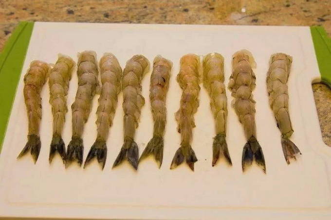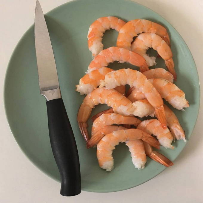 - Garnalen bereiden. Kies de grotere: koninklijk of tijger. Ze zullen niet braden en er zit veel meer vlees in dan in kleine. Ontdooi ze en pel ze af. Als er koppen zijn, scheur ze dan ook af. Verwijder de slokdarm. Gooi al het afval meteen weg, anders gaat het al snel onaangenaam ruiken.