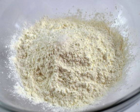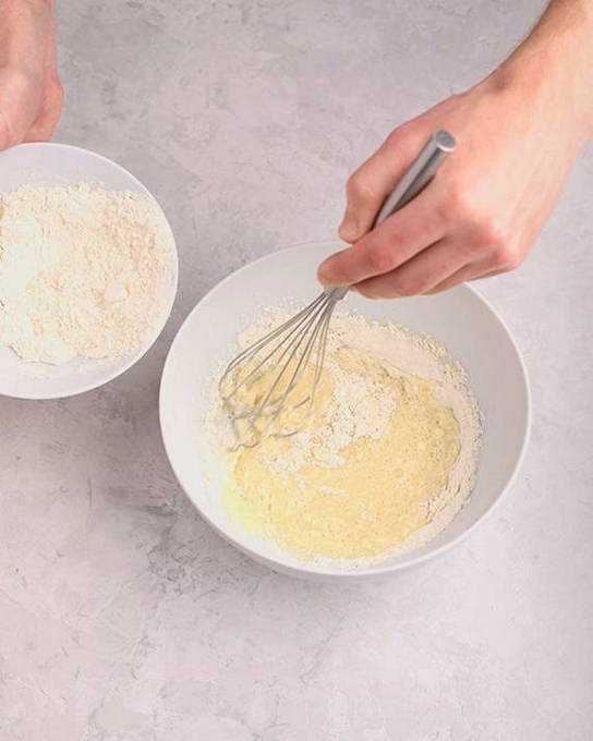 Zaai een glas bloem in een diepe kom, voeg zetmeel en fijn zout toe. Roer goed door met een garde.