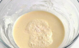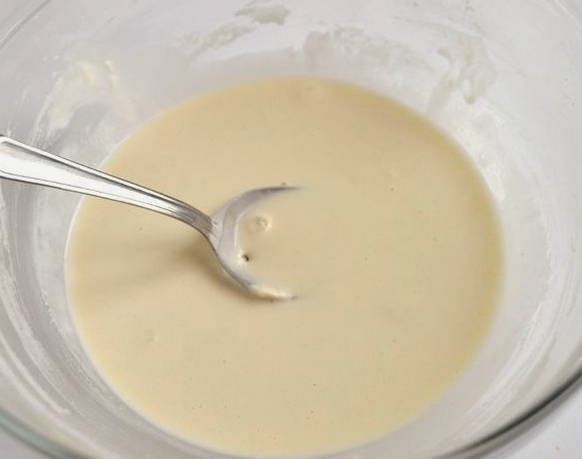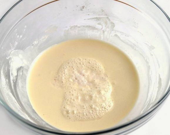 Verhit na een half uur een koekenpan met plantaardige olie en haal het deeg uit de koelkast. Giet bakpoeder en gebluste soda in het deeg. Meng grondig. Het is belangrijk om deze droge ingrediënten vlak voor het frituren toe te voegen, zodat het beslag luchtig en krokant wordt.