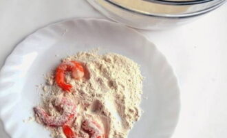 - Ontdooi de gepelde garnalen zonder de magnetron te gebruiken. Als de garnaal intact is, verwijder dan de schaal, kop en darmen. Zeef tarwebloem in een kleine diepe kom, voeg zout, peper en gedroogde knoflook toe. Roeren. Dompel de garnalen in het mengsel van droge ingrediënten, de bloem moet de zeevruchten volledig en stevig bedekken.