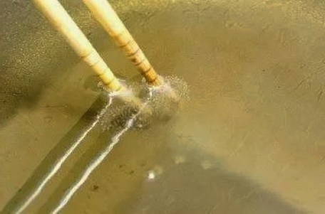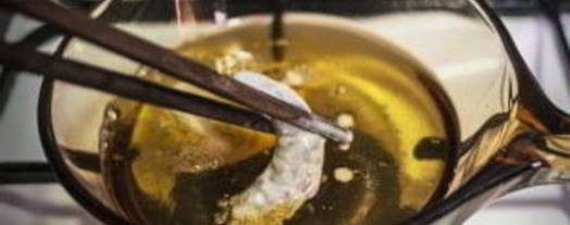 - Giet 3 tot 4 cm plantaardige olie in een kleine steelpan of koekenpan met hoge zijkanten. Het moet geurloos zijn om geen extra smaak aan het gerecht toe te voegen. Verwarm het op het fornuis voor op 180 graden. Gebruik een Aziatische culinaire lifehack om de temperatuur te controleren. Doop de punten van houten stokjes in hete olie. Als er zich intense bubbels omheen vormen, is het tijd om de garnalen te bakken. Dip zeevruchten in beslag.