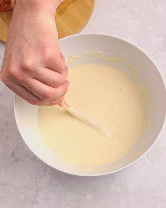 - Doop de garnalen in het beslag. Houd voor het gemak de staarten van de karkassen vast. Het deeg moet gelijkmatig over het hele oppervlak van de garnalen worden verdeeld, dus zorg ervoor dat het beslag dik is en dat er geen klontjes zijn.