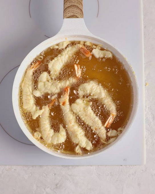 - Breng de garnalen over in hete olie. Bak 1-2 minuten tot er een heerlijke gouden korst ontstaat. Draai de garnalen voorzichtig om met eetstokjes of een vork en kook ze niet langer dan 2 minuten.
