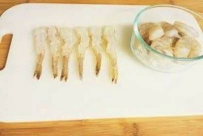 - Ontdooi de grote, gekookte diepgevroren garnalen. Doe het op een natuurlijke manier door warm te blijven. Vermijd het gebruik van een magnetron of kokend water om te voorkomen dat de volle smaak van de zeevruchten wordt aangetast. Verwijder het hoofd en de schaal. Snijd de garnalen langs de rug in en verwijder voorzichtig de darmen. De staart hoeft niet verwijderd te worden. Maak een kleine incisie in het midden van de buik van de garnaal om te voorkomen dat deze tijdens het frituren kromtrekt.