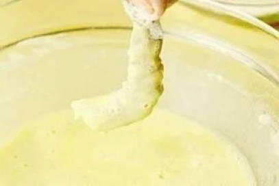- Bereid frituurolie. Giet sesamolie in een schaal met hoge wanden en een dikke bodem. Zo niet, dan kunt u elke geurloze plantaardige olie en additieven gebruiken. Er moet voldoende vloeistof zijn om de garnalen volledig te bedekken. Terwijl het vet aan het opwarmen is, maak je het beslag klaar. Klop in een diepe kom het ei los met koud water.
