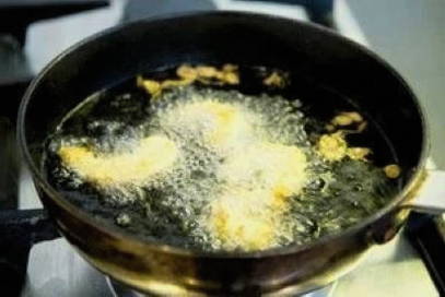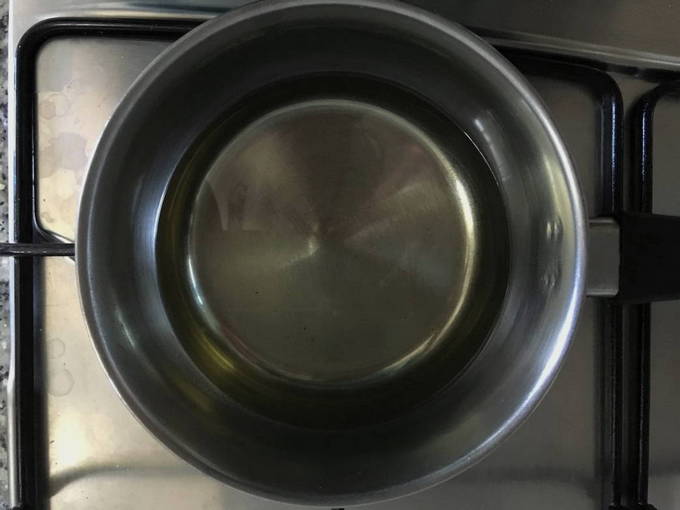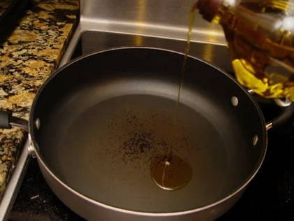 - Verhit plantaardige olie in een koekenpan of steelpan. Het moet behoorlijk heet zijn, dat kun je zien aan de lichte waas die verschijnt.
