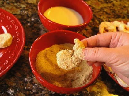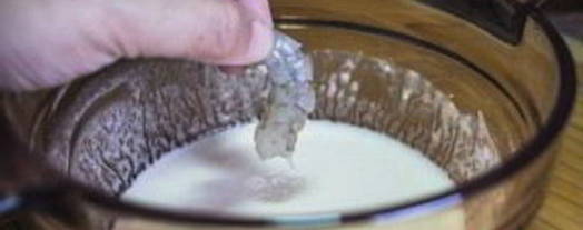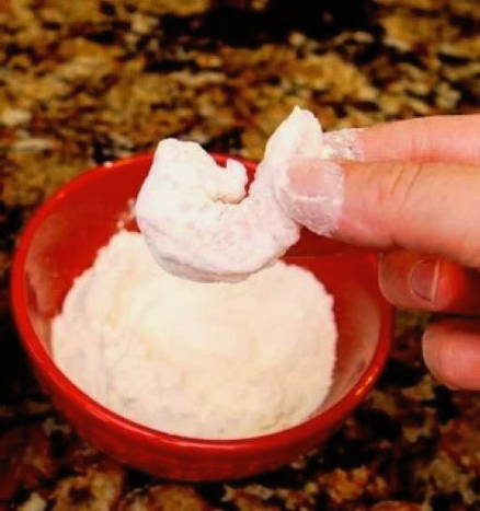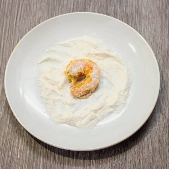 - Doop de garnalen in het ei in rijstmeel. Zo niet, dan kun je tarwe gebruiken. Zeef het zeker door een zeef zodat er geen klontjes ontstaan.