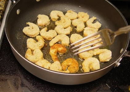- Verhit een koekenpan met olijfolie op het fornuis. U kunt in plaats daarvan elke ongeraffineerde plantaardige olie gebruiken. Het onderscheidt zich door zijn gebrek aan smaak, wat belangrijk is bij het koken van zeevruchten. Leg de gepaneerde garnalen in een koekenpan. Er moet een afstand tussen de zeevruchten zijn, plaats ze niet dicht bij elkaar, anders blijft de paneermeel aan elkaar plakken. Bak de garnalen 2 minuten aan elke kant. Voeg aan het einde van het koken gehakte knoflook toe en roer.