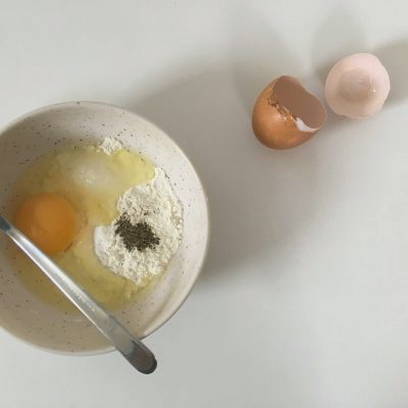 - Zeef voor het beslag de bloem in een diepe kom. Breek een ei in dezelfde kom, voeg zout en peper toe. Roer het mengsel goed door tot er een homogeen deeg ontstaat met zo min mogelijk klontjes.