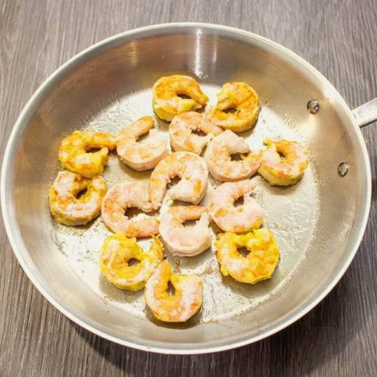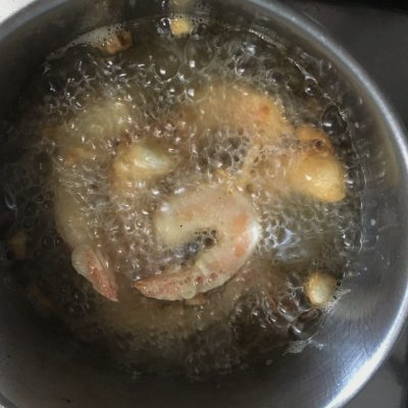 - Leg de garnalen in hete olie en bak ze 3-4 minuten tot ze zacht zijn.