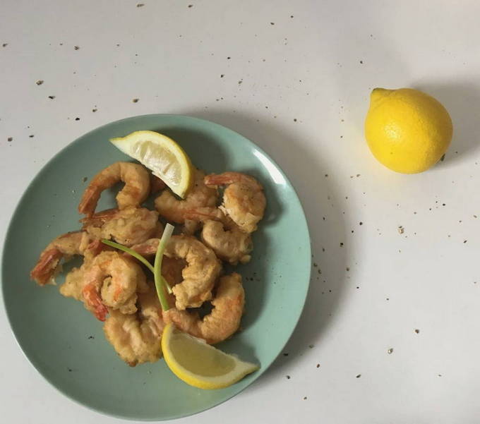 - Dompel de garnalen aan alle kanten in het beslag. Om de garnalen van binnen sappig te houden, kun je ze eerst besprenkelen met een beetje citroensap.