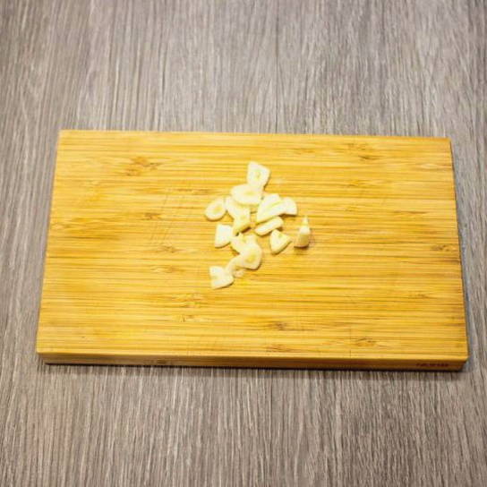 - Pel de knoflookteentjes en spoel de groente af. Snijd het overdwars in kleine stukjes.