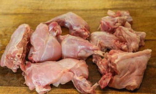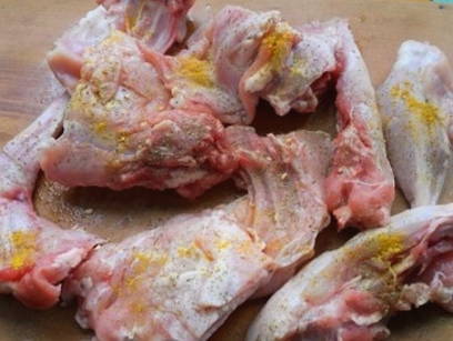 - Snijd het konijnenkarkas in porties, zout en breng op smaak.