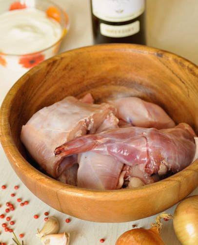 Om het konijnenvlees mals en sappig te maken, moet je er veel tijd aan besteden. In de oven wordt het door lang bakken geurig, rijk van smaak en erg zacht, vooral als het in zure room wordt gekookt.