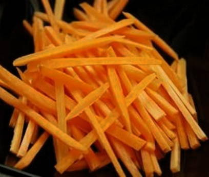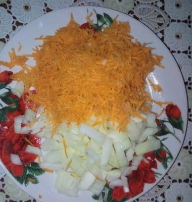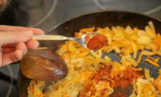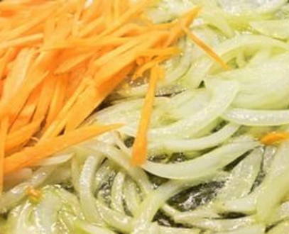 Bak in een aparte koekenpan de uien en wortels, voeg paprika toe aan de groenten.