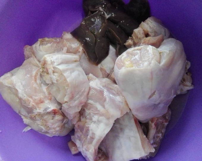 Was het konijnenkarkas, snijd het in stukjes. Week het vlees eerst een uur in koud water met een beetje azijn, hierdoor verdwijnt de specifieke geur.