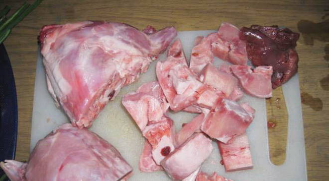 - Was het konijnenkarkas en snij in kleine stukjes. Snijd het spek in dunne plakjes.