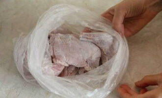 Dep de stukken vlees met keukenpapier, doe ze in een zak, bedek ze met bloem, zout en kruiden, schud goed.