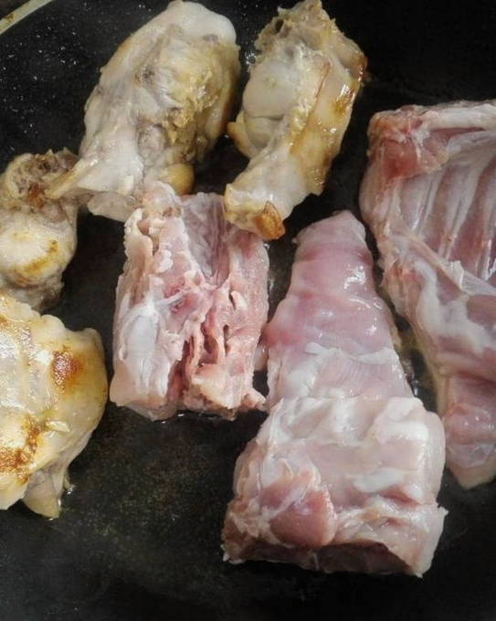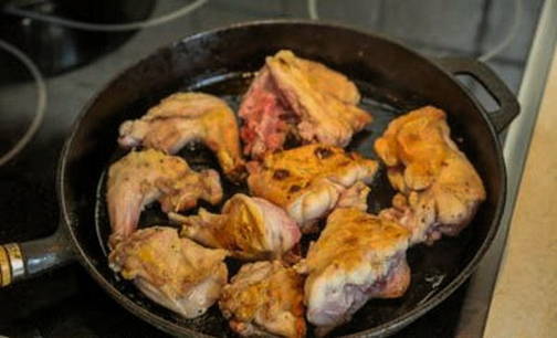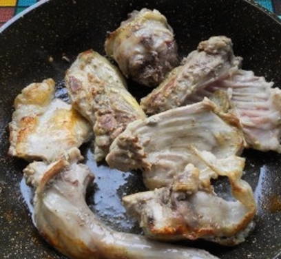 - Verhit plantaardige olie en boter in een koekenpan, bak het konijnenvlees aan beide kanten goudbruin.