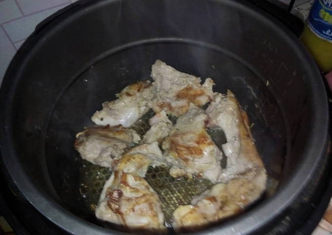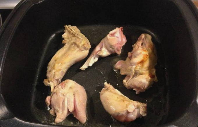- Schakel de "Fry" -modus in, verwarm de plantaardige olie in de multicooker-kom, leg het konijn en bak het aan alle kanten goudbruin.