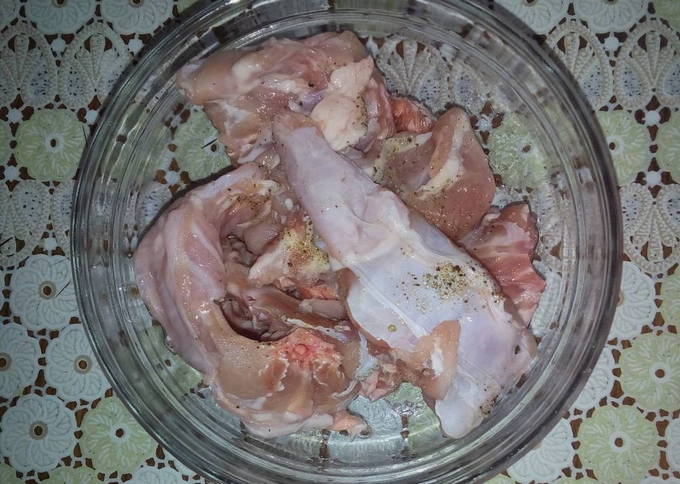 - Verdeel het konijnenkarkas in delen, bestrijk ze met zout en gemalen peper.