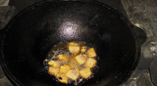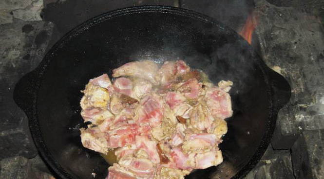 - Verhit plantaardige olie in een ketel en voeg reuzel toe. Het is noodzakelijk om al het vet uit het vet te verdampen en te voorkomen dat het verbrandt.