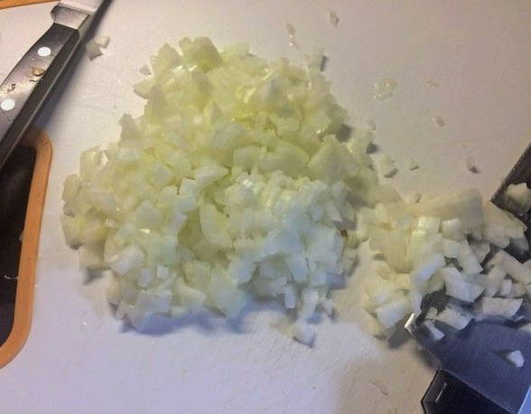 Hak de ui fijn, rasp de wortelen op een grove rasp.