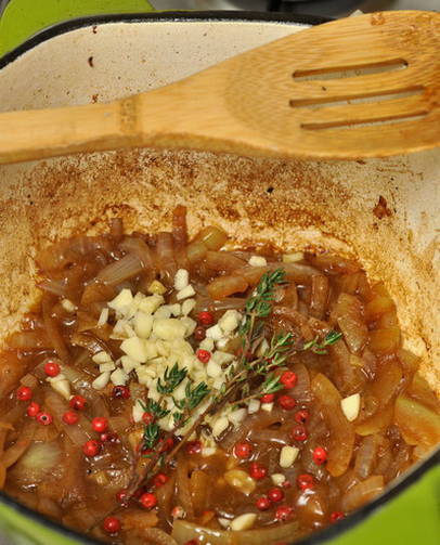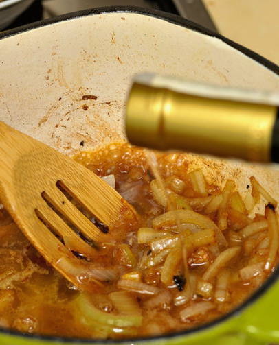 - Als het vlees goed bruin is, voeg je de uien eraan toe.
