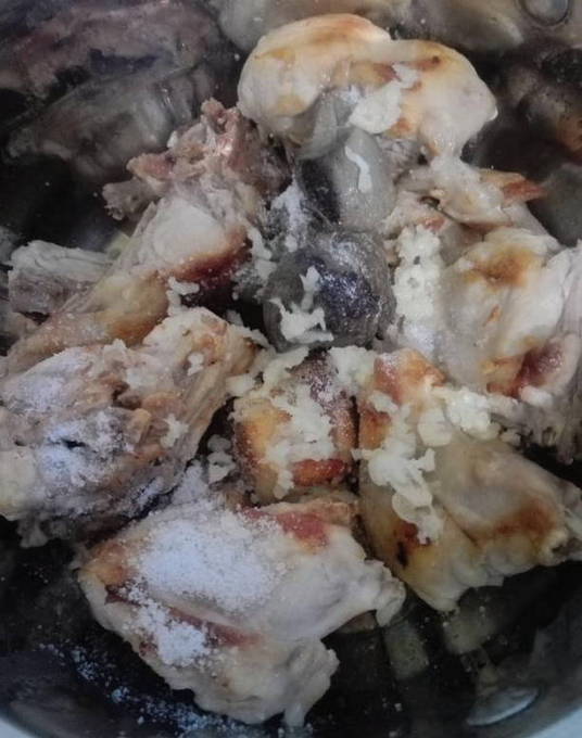 - Breng het vlees over in een pan met dikke bodem, breng op smaak met zout en breng op smaak, voeg de knoflook door een pers toe.