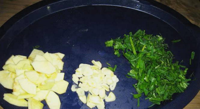 - Snijd de ui, knoflook, appel, kruiden en wortelen.