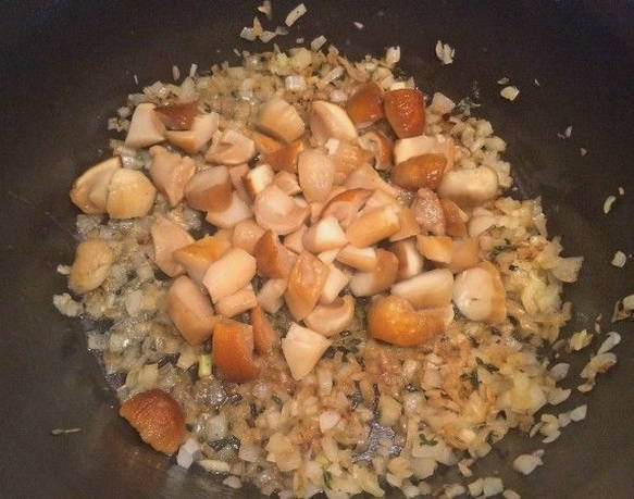 - Fruit vervolgens de uien, champignons en tijm op middelhoog vuur. Bak tot al het vocht uit de champignons is verdampt.