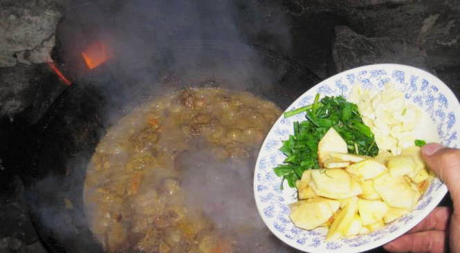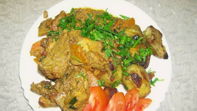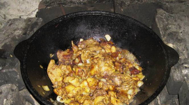- Breng de inhoud van de pan aan de kook, zet het vuur lager, dek af en laat 80-90 minuten sudderen. Serveer het gekookte vlees met een bijgerecht naar keuze.