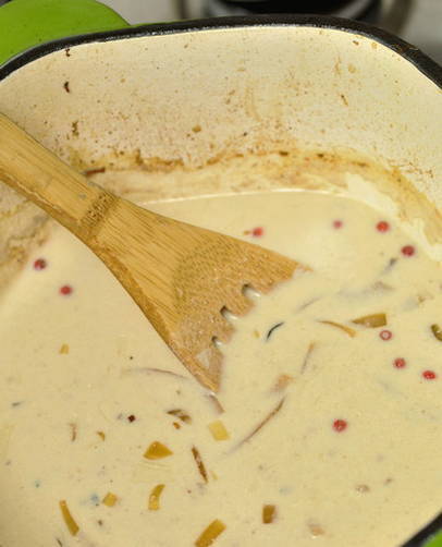 - Giet zure room en bouillon erbij, roer en zout naar smaak.
