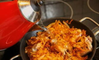 Breng vervolgens de groenten over naar het konijn, voeg water toe, dek af en laat 50-60 minuten op laag vuur sudderen.