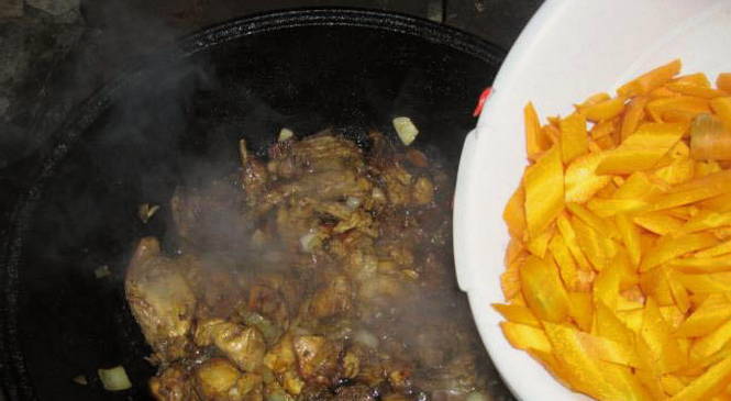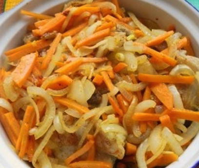 - Was het vlees, snijd het in porties. Snijd de uien en wortelen in willekeurige volgorde. Plet de knoflook gewoon met de platte kant van een mes.