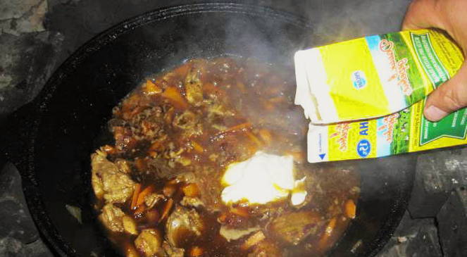 - Spreid de zure room uit en giet het water erin zodat het het vlees volledig bedekt.