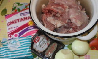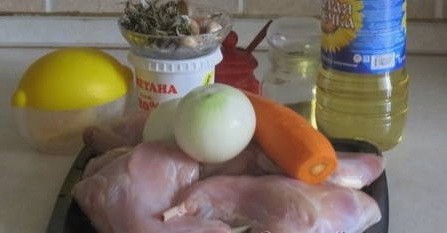 - Laten we de benodigde ingrediënten voorbereiden. We wassen de stukjes konijn van tevoren en schillen de groenten.